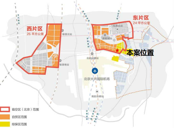 与大兴国际机场无缝衔 接,规划面积4.35平方公 里,其中区块一(机场红 线内)规划面积0.83平方 公 里 , 区 块 二 规 划 面 积 3.52平方公里。 地处河北自由贸易试验 区大兴机场片区和北京大 兴机场临空经济示范区; 横跨京冀两地,是京津冀 协同发展的重要平台。