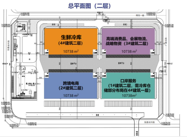仓库6万平米,层高:一层11m,二层7.9m 。承重:一层3t/㎡,二层2t/㎡。防火等级:一级 。车位437个,租金(含物业):1.6元/天/㎡。常温库,可以改造冷藏冷冻,2000起租,也可以托管,托管面积500平米起。
