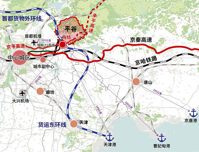 · 铁网:平谷铁路南与京哈线联通,北与首都货运外环线铁路联通,在建轻轨22号线也将于2025年全线交付运营;