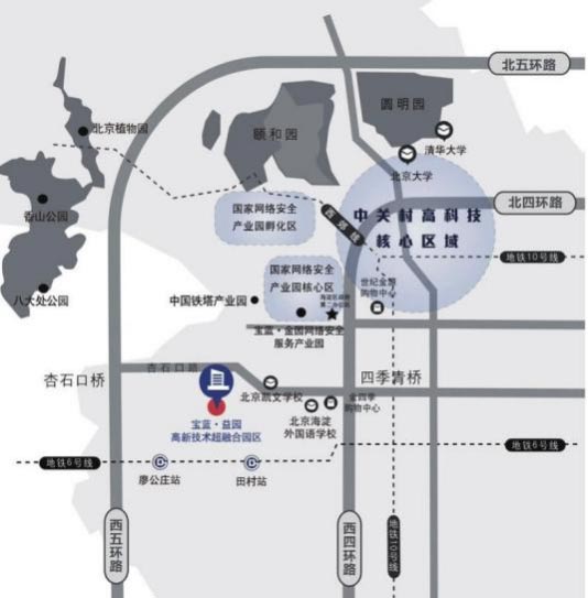 宝蓝·益园高新技术超融合园区,位于北京市海淀区杏石口路80号,地处“西山文化创意大道”的核心区域,是海淀区十二五重点项目。园区北邻杏石口路,西靠中间建筑别墅群,东距西四环四季青桥3公里,西临西五环杏石口桥1公里,约15分钟车程直达中关村核心区。