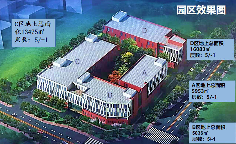 我公司位于开发区路东区的核心地块,占地面积20366㎡,总建筑面积48488㎡,在开发区规划中,也是属于较大规模的公司。园区内两栋建筑分为4个区域,其中A区地上总面积5953㎡,B区地上总面积5836㎡,C区地上总面积13475㎡,D区地上总面积16083㎡。建筑层高分为1层5.1m,2-5层4.6m,均为标准厂房设计,每平方米承重500kg,符合国家标准。
